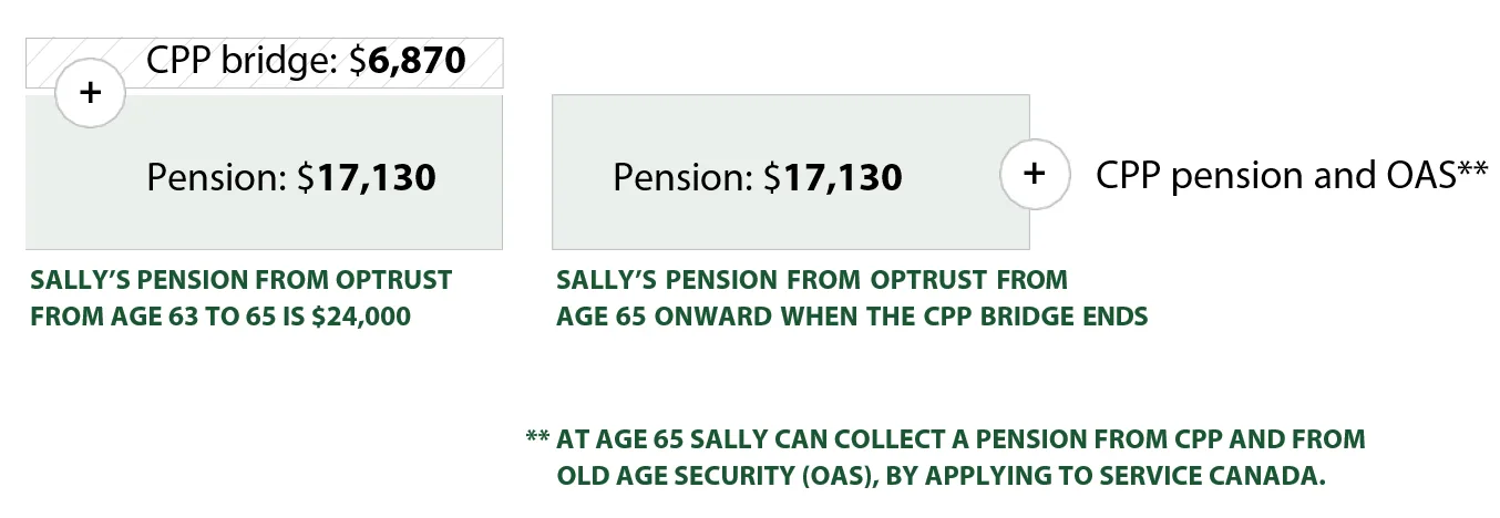 Your CPP pension does not start automatically. You must apply for it through Service Canada. It is also important to note that the actual amount of your CPP benefit is based on the CPP formula and depends on your individual circumstances. Your CPP benefit will not equal the amount of the CPP bridge payable to you from the OPSEU Pension Plan. This means it is possible that your combined pension from the OPSEU Pension Plan and CPP after you turn 65 may be less than the amount you were receiving before you turned 65.